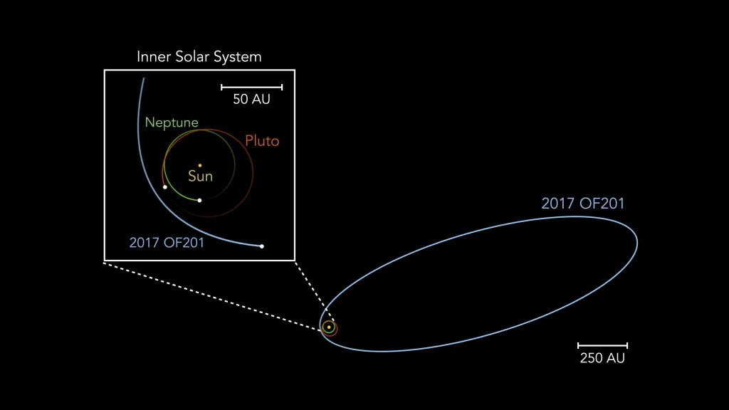 Sistemul nostru solar tocmai s-a mărit — sau, mai degrabă, a dezvăluit unul dintre membrii săi cei mai discreți. Botezat 2017 OF201, acest obiect transneptunian (OTN) recunoscut oficial în mai 2025 este mult mai mult decât o simplă pietricică pierdută în spațiu: ar putea revoluționa înțelegerea noastră asupra celor mai îndepărtate regiuni ale Sistemului solar și ar putea pune sub semnul întrebării una dintre cele mai fascinante ipoteze ale astronomiei moderne — cea a misterioasei Planete 9. Descoperită pe baza datelor din arhive de către o echipă condusă de Sihao Cheng, de la Institute for Advanced Study, 2017 OF201 este acum clasificată ca planetă pitică. Diametrul său este estimat la aproximativ 700 de kilometri, adică o treime din cel al lui Pluton. Ceea ce o face atât de greu de detectat este orbita sa gigantică: îi trebuie 25.000 de ani pentru a înconjura Soarele. Cu alte cuvinte, se apropie de noi foarte rar: potrivit astronomilor, obiectul este vizibil doar 1% din timpul său orbital. Orbita sa este extrem de îndepărtată: în timp ce Pământul se află la 1 unitate astronomică (UA) de Soare, 2017 OF201 se îndepărtează până la 1.600 UA la afeliu (punctul cel mai îndepărtat) și se apropie la minimum 44,5 UA, adică o distanță comparabilă cu cea a lui Pluton. Aceste caracteristici au permis cercetătorilor să îl identifice în datele vechi, dar sunt și cele care fac detectarea obiectelor similare atât de dificilă. Noul obiect ceresc a fost descris într-un articol postat pe serverul de preprinturi arXiv.