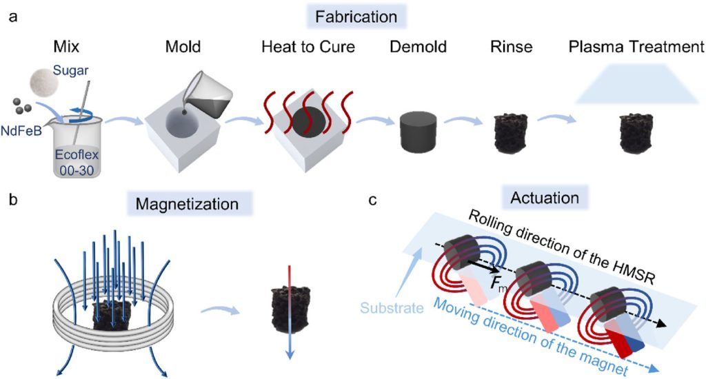 Secretul acestei performanțe constă în structura unică a robotului. Fabricat dintr-un amestec de particule magnetice de neodim, zahăr și un polimer puternic, acesta se mândrește cu un design ingenios: zahărul este dizolvat după fabricare, creând o structură poroasă care mărește suprafața de contact cu lichidele. Un tratament cu plasmă face ca suprafața sa să fie hidrofilă, ceea ce înseamnă că este atrasă în mod natural de apă. În cele din urmă, particulele magnetice integrate permit ca robotul să fie ghidat cu precizie folosind un câmp magnetic simplu. Rezultatul: robotul poate aluneca, se poate întoarce, poate accelera sau decelera, transportând în același timp picături de aproape un mililitru – o performanță impresionantă la această scară.