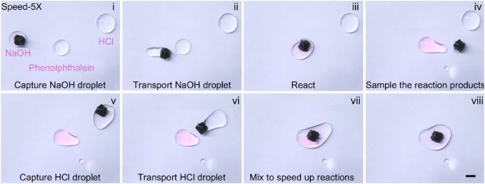 În laboratoarele din întreaga lume, multe manipulări chimice au loc în pahare de laborator sau pe plăci fierbinți. Dar la scară microscopică, unde volumele de lichid sunt atât de mici încât sunt măsurate în microlitri (sau mai puțin), provocările devin mult mai complexe. Cum pot fi amestecate, transportate sau împărțite fluidele rapid, curat și fără risc de contaminare? Aceasta este exact problema pe care o echipă de la Academia Chineză de Științe și Institutul de Cercetare a Energiei Electrice din China a căutat să o rezolve. Răspunsul lor: un microrobot ultra-rapid, complet controlat de la distanță, conceput să interacționeze direct cu picăturile de lichid fără a lăsa reziduuri.