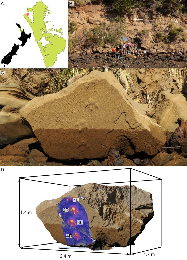 Urmele au fost găsite pe plaja Manunutahi, situată în Golful Mosquito, în regiunea Kaipara din Insula de Nord. Cercetătorii au observat „patru amprente pozitive în relief și o amprentă negativă în relief”, urme care au atras imediat atenția datorită dimensiunii și formei lor atipice. Urmele au fost analizate de o echipă științifică multidisciplinară, care a folosit o serie de tehnici pentru a determina identitatea păsării și pentru a estima vârsta urmelor. Această analiză a confirmat că aceste urme erau cele ale unui moa, un gigant al faunei pleistocenului din Noua Zeelandă, care a trăit cândva pe insule.