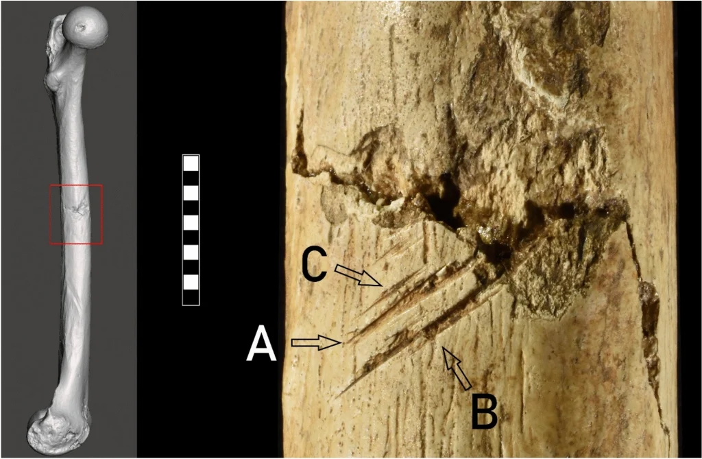Bioarheologul Vitale Sparacello de la Universitatea din Cagliari a atras atenția asupra unor urme ciudate vizibile pe femurul stâng al individului. Trei linii paralele, curate, drepte. Apoi încă două pe tibie. Aceste crestături sunt prea regulate pentru a fi cauzate de eroziune, carnivori sau orice altă întâmplare. Analizând forma, adâncimea și orientarea lor, cercetătorii au concluzionat: au fost cauzate de arme proiectile cu vârf de silex, aruncate cu forță.