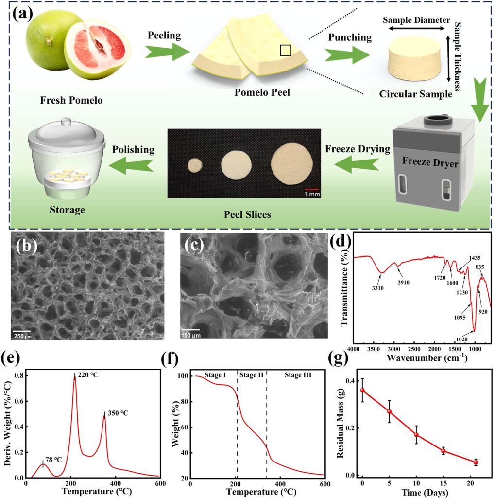 Pomelo este un fruct cultivat în special în țări precum China, Vietnam, Statele Unite și Mexic. Acesta cântărește între unu și două kilograme și are o coajă foarte groasă (între 30 și 50% din masa fructului), care ajunge în general la deșeurile menajere, la fel ca cea a majorității fructelor pe care le consumăm. În Statele Unite, cercetătorii au găsit o modalitate de reciclare a cojii de pomelo, după cum se arată într-un articol publicat în revista ACS Applied Material & Interfaces . Agronomii de la Universitatea din Illinois au analizat proprietățile acestei coji și au estimat că aceasta ar putea fi irosită, producând în același timp energie mecanică. Trebuie remarcat faptul că această coajă pomelo este formată din două straturi, primul (exterior), care este extrem de subțire, și al doilea (interior), care este alb și gros. Autorii studiului au decis să separe aceste straturi pentru a păstra al doilea strat, spongios, înainte de a-l tăia în bucăți mici. Acesta reprezintă de fapt biomasa din coaja fructului, adică materia sa organică. Oamenii de știință au folosit apoi un plastic din poliamidă pentru o frecare c biomasa și a genera un curent electric. Acest schimb de electroni între straturile de material poartă un nume: triboelectricitate. Conform rezultatelor, este posibil să se obțină o descărcare capabilă să alimenteze aproximativ douăzeci de LED-uri. Autorii studiului au dezvoltat apoi un generator triboelectric din biomasă de pomelo care poate furniza o tensiune în circuit deschis de 58 V și o densitate de putere de vârf de 254,8 mW/m2. Acest lucru deschide calea alimentării dispozitivelor mici, cum ar fi calculatoarele și ceasurile sportive, fără electricitate externă, prin simpla forță mecanică.