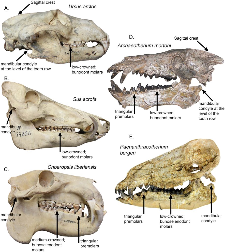 Antracoterii și entelodonții aveau caracteristici morfologice particulare, ca o combinație de animale diferite. De fapt, cercetătorii încă pun la îndoială comportamentul lor și în special obiceiurile lor alimentare. Entelodonții, de exemplu, păreau să aibă multe în comun cu porcii omnivori, dar unii și-i imaginau și ca potențiali prădători sau mari necrofagi, precum hienele moderne. Pentru a afla mai multe, cercetătorii de la Institutul Catalan de Paleoecologie Umană și Evoluție Socială au examinat dinții fosilizați ai mai multor specimene. Toate au evoluat în sudul Franței acum aproximativ 30 de milioane de ani (perioada Oligocen). Este posibil să se determine dieta unei specii dispărute analizând tiparele săpate în dinți de alimentele consumate. De exemplu, oasele și semințele tind să lase găuri, în timp ce ierburile și frunzișul lasă în mod regulat zgârieturi. Aceste micro-urmături sunt invizibile cu ochiul liber, dar sunt foarte prezente. Echipa a comparat apoi aceste modele de microuzură cu cele ale altor mamifere cu diete cunoscute, cum ar fi mistreții, urșii, leii, hipopotamii și caii. Conform analizelor, antracoterii păreau să aibă o dietă constând din aproape toate produsele pe bază de plante. Micro-uzura dinților lor prezenta, de fapt, asemănări cu cea a mamiferelor care pășunează și frugivorele.