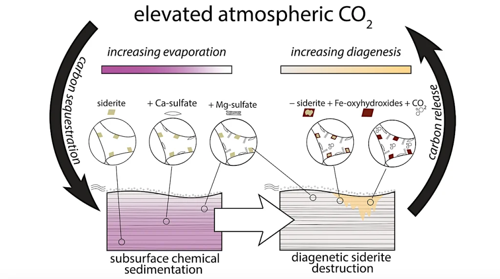 De fiecare dată când apa lichidă era prezentă, ea reacționa cu CO₂-ul, formând minerale carbonatice care blocau gazul în sol. Astfel, carbonul atmosferic dispărea progresiv ori de câte ori condițiile erau potrivite — dar fără a fi reînnoit.