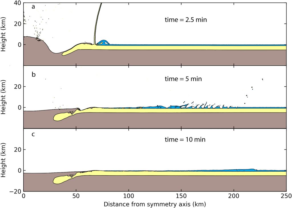 În plus față de aceste efecte atmosferice, impactul a generat și un cutremur cu o magnitudine de peste 11 grade. Intensitatea sa a fost de așa natură încât a deformat solul și fundul oceanului ca un covor scuturat. Acest cutremur extrem a provocat prăbușirea platformelor submarine și deplasarea unor mase uriașe de sedimente. La scurt timp după aceea, un tsunami de o amploare inimaginabilă a măturat fundul marin slăbit și fluidizat. Pe măsură ce valurile au întâlnit relieful submarin, au sculptat formațiuni geologice enorme, cunoscute astăzi sub denumirea de ”megaondulații”, care stau mărturie pentru violența fără precedent a acestei catastrofe.