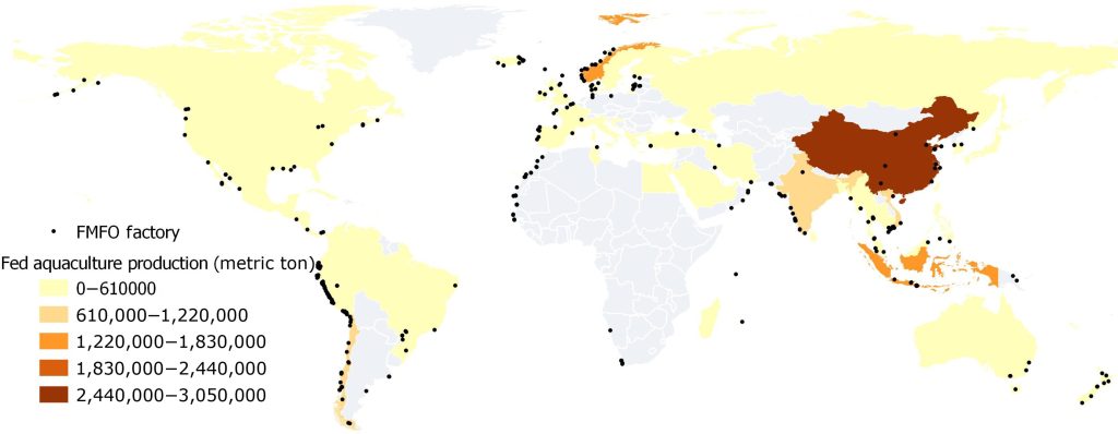 Acest comerț global valorează câteva miliarde de dolari, dar până de curând nu era clar unde se aflau fabricile care procesează acești pești pelagici mici – sardine, scrumbii, hamsii – în hrană pentru pești. Acest lucru a fost realizat acum datorită unei echipe de cercetători de la Universitatea din British Columbia (UBC), care a ridicat vălul de pe una dintre cele mai opace verigi din industria alimentară globală. Studiul, publicat în Science Advances, dezvăluie prima bază de date georeferențială și publică a instalațiilor de producție a FMFO. În total, 506 instalații au fost amplasate în 63 de țări, reprezentând peste 400 de companii diferite. Deloc surprinzător, cei mai mari producători se află în țări bogate în resurse piscicole: Peru este în frunte cu 125 de fabrici, urmat de Mauritania (42) și Chile (39). Există însă și centre de producție semnificative în Vietnam, China, Danemarca și Statele Unite.