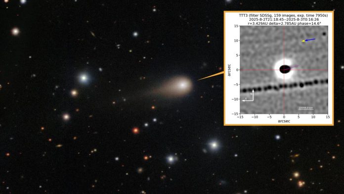 Combinând 159 de expuneri de câte 50 de secunde fiecare, imaginea compozită relevă corpul înghețat (sau nucleul) al cometei 3I/ATLAS sub forma unui punct mare, negru, înconjurat de o aură albă. O ruptură bruscă, în formă de evantai, în acest inel strălucitor indică locul unde cercetătorii spun că un jet mare și rapid de material (marcat în violet) este expulzat de pe cometă în direcția Soarelui. Imaginea a fost distribuită pe site-ul de monitorizare a obiectelor transiente The Astronomer’s Telegram pe 15 octombrie, dar nu a fost încă publicată într-un studiu evaluat de experți.