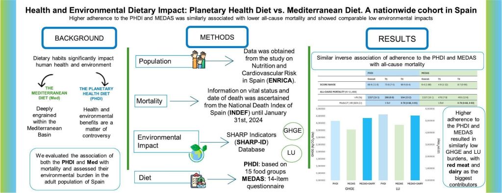 Dieta mediteraneeană, binecunoscută în Europa, se bazează și pe un consum ridicat de produse vegetale, cu uleiul de măsline ca grăsime principală, și un loc important acordat cerealelor, peștelui, lactatelor și cărnii albe. Diferența majoră constă în impactul ecologic al regimului planetar, care pune un accent mai mare pe durabilitate. Cercetătorii au măsurat și impactul asupra mediului al fiecărei diete: dieta bună pentru planetă generează în medie 4,15 kg de CO₂ pe zi și necesită 5,54 m² de teren agricol, față de 4,36 kg de CO₂ și 5,43 m² pentru dieta mediteraneeană. Din nou, rezultatele sunt apropiate, dar dieta bună pentru planetă menține un ușor avans ecologic.