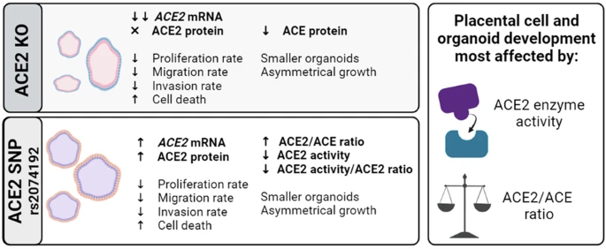 În această cercetare, oamenii de știință au modificat genetic organoide placentare pentru a șterge sau a modifica gena ACE2 pentru a testa efectele acesteia asupra dezvoltării placentare. Rezultatele au fost atunci izbitoare. Într-adevăr, placentele lipsite de această genă sau purtând o versiune modificată au prezentat o dezvoltare mai lentă și mai puțin simetrică decât cele a căror genă era intactă. În plus, raporturile dintre ACE și ACE2 au fost perturbate în aceste organoide, sugerând că echilibrul dintre aceste două proteine este esențial pentru ca placenta să se dezvolte corect. Legătura dintre modificările genei ACE2 și problemele de creștere placentară relevate de studiu ar putea explica astfel anumite complicații grave ale sarcinii, cum ar fi preeclampsia sau întârzierea creșterii fetale. Aceste boli sunt adesea cauzate de o placentă care nu reușește să hrănească și să oxigeneze corespunzător fătul. Prin evidențierea rolului cheie al ACE2, acest studiu deschide, prin urmare, noi perspective pentru înțelegerea și tratarea acestor patologii.