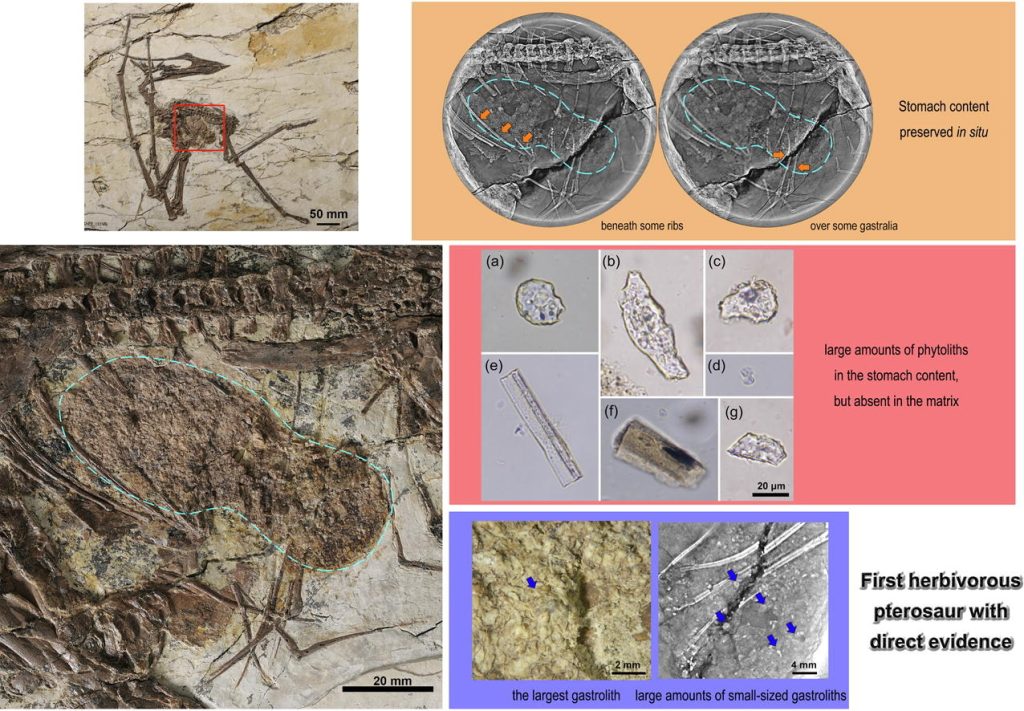 Această specie, parte a familiei Tapejaridae – pterozauri fără dinți –, a fost examinată cu ajutorul imagisticii 3D cu raze X, care a permis o privire detaliată în interiorul corpului fără a deteriora fosila. Rezultatul a fost uluitor: în locul rămășițelor de pește sau alte indicii ale unei diete carnivore, stomacul conținea un material asemănător argilei, bogat în fitoliți – microcristale produse de plante pentru a-și rigidiza țesuturile. Aceste structuri, supranumite „fosile microscopice vegetale”, pot supraviețui milioane de ani după descompunerea plantei, servind drept dovezi clare ale unei alimentații erbivore.