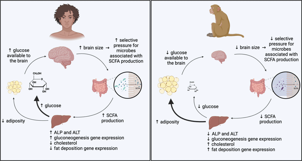 Publicat în revista Microbial Genomics, un studiu condus de departamentul de antropologie de la Universitatea Northwestern (Statele Unite) a stabilit o legătură puternică între microbiomul intestinală și dezvoltarea creierului pe parcursul evoluției. Cercetătorii au spus că au studiat variațiile metabolice dintre diferitele specii de primate și oameni, adică variațiile cu privire la cât de repede organismul procesează alimentele. Obiectivul? Identificare factorilor ce diferențiază speciile cu creier dezvoltat de celelalte. Să menționăm faptul că anterior, noțiunea de microbiom fusese neglijată în favoarea altor factori considerați mai relevanți, în special de mediu și genetici.