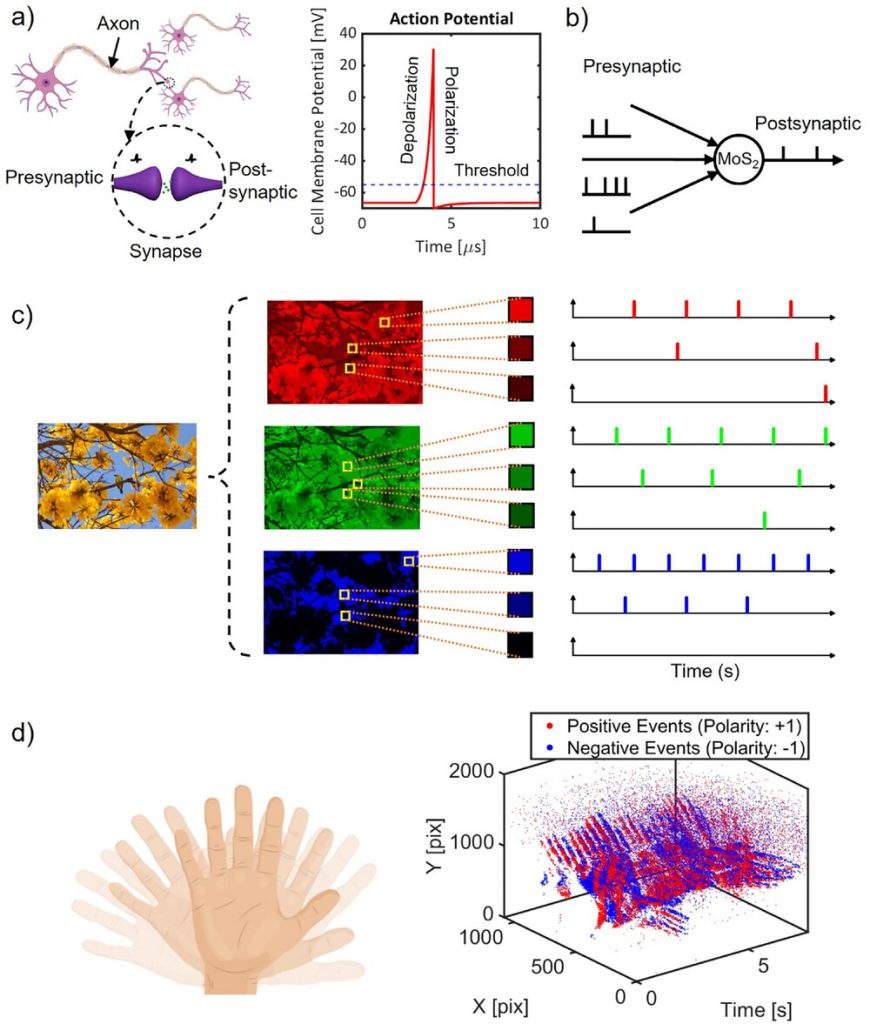 MoS₂ este un compus metalic care, la scară atomică, are defecte naturale care îi permit să detecteze lumina și să o transforme în semnale electrice. Acest comportament îl imită pe cel al neuronilor din creier, care captează și transmit semnale vizuale. Folosind straturi ultra-subțiri de MoS₂ obținute prin depunere chimică în stare de vapori, cercetătorii au proiectat un dispozitiv capabil să simuleze încărcarea și descărcarea electrică a unui neuron conform modelului LIF. Acest sistem poate detecta variațiile de lumină, „pornește” atunci când este atins un prag și apoi se resetează rapid datorită unui control precis al tensiunii electrice. Acest mecanism permite dispozitivului să acționeze ca un neuron real, cu capacitatea de a reacționa rapid și eficient.