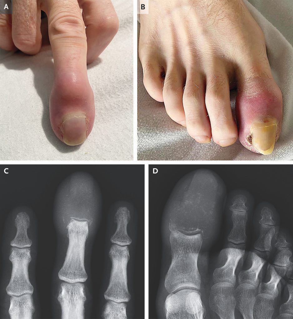 Totul a început aparent inofensiv: timp de șase săptămâni, degetele mijlociu și mare de la piciorul drept au început să se deformeze treptat, căpătând o formă ciudată, asemănătoare cu cea a unei „bâte de tobe”. Alarmat de evoluția simptomelor, bărbatul s-a prezentat la spital, unde medicii au descoperit mult mai mult decât un simplu edem. Extremitățile erau roșii, umflate și prezentau chiar un ulcer în apropierea unghiei.